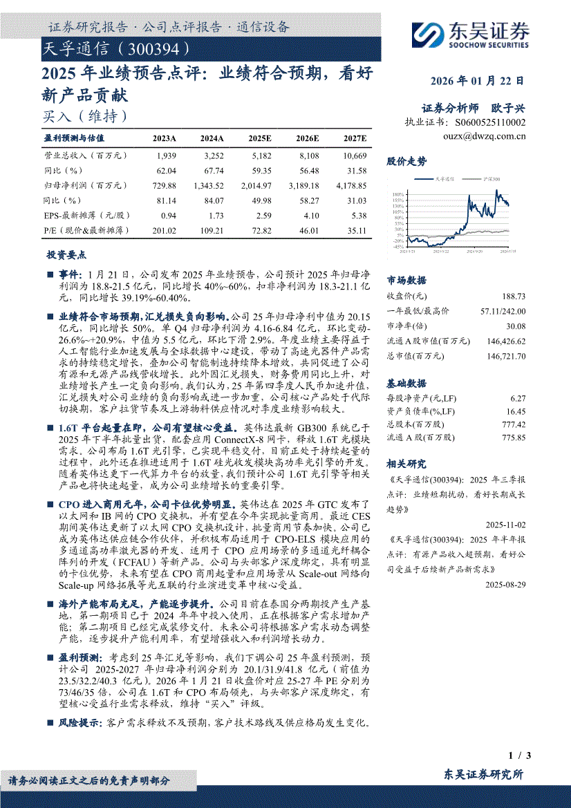 天孚通信:東吳證券-天孚通信-300394-2025年業(yè)績(jī)預(yù)告點(diǎn)評(píng):業(yè)績(jī)符合預(yù)期,看好新產(chǎn)品貢獻(xiàn)-260122