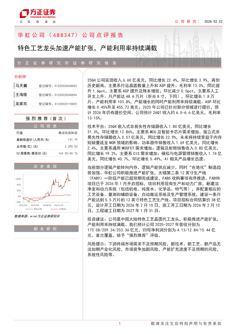 華虹公司:方正證券-華虹公司-688347-公司點評報告:特色工藝龍頭加速產(chǎn)能擴張,產(chǎn)能利用率持續(xù)滿載-260222