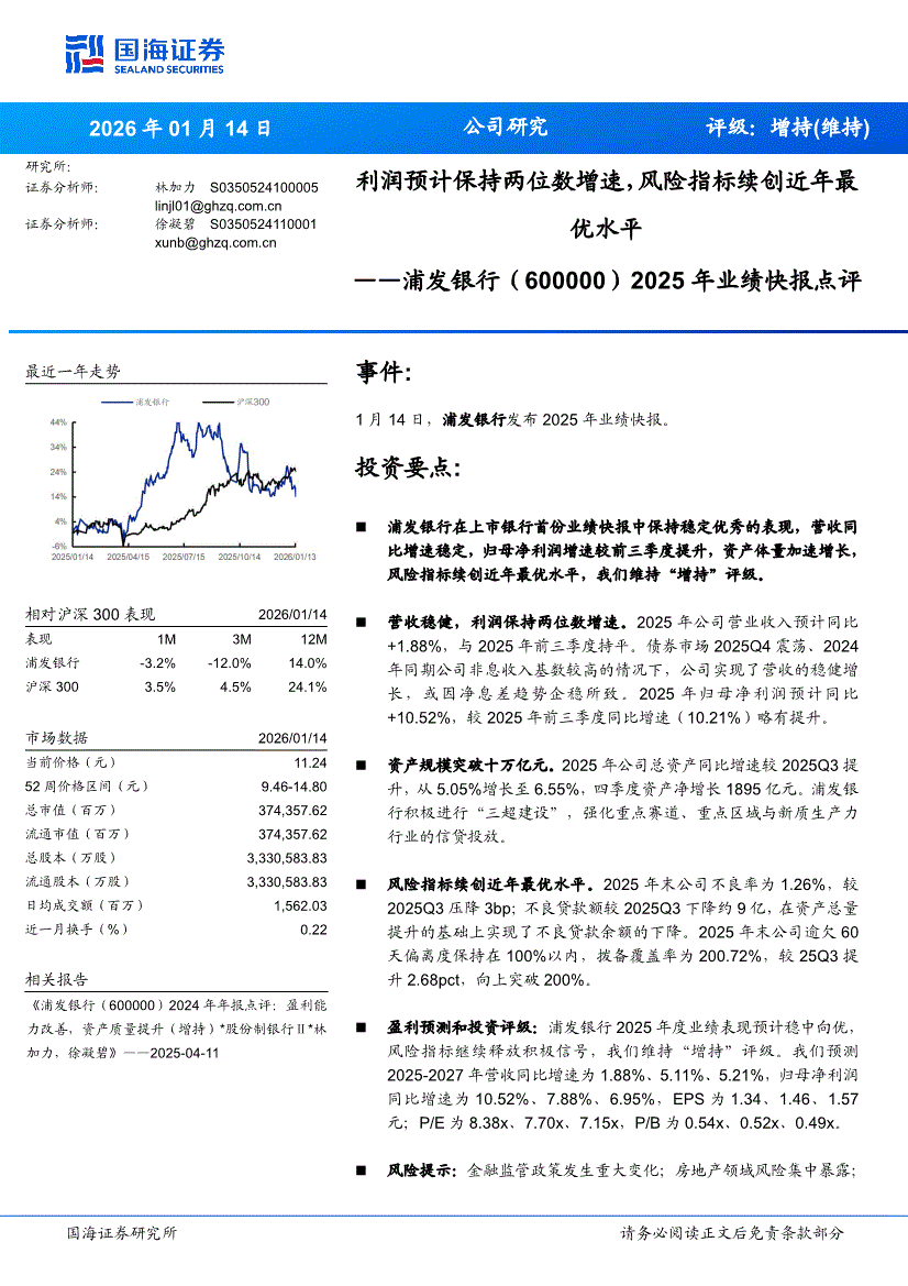 浦發(fā)銀行:國海證券-浦發(fā)銀行-600000-2025年業(yè)績快報(bào)點(diǎn)評(píng):利潤預(yù)計(jì)保持兩位數(shù)增速,風(fēng)險(xiǎn)指標(biāo)續(xù)創(chuàng)近年最優(yōu)水平-260114