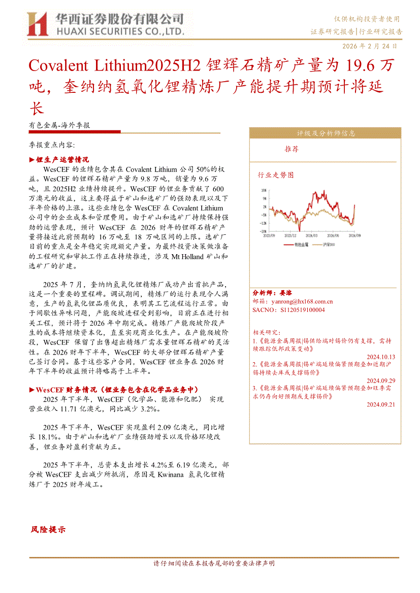 有色金屬行業(yè):華西證券-有色金屬行業(yè)~海外季報(bào):Covalent Lithium2025H2鋰輝石精礦產(chǎn)量為19.6萬噸,奎納納氫氧化鋰精煉廠產(chǎn)能提升期預(yù)計(jì)將延長-260224