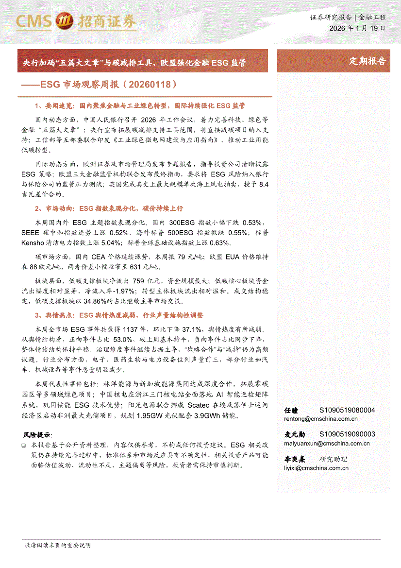 招商證券-ESG市場觀察周報(bào):央行加碼“五篇大文章”與碳減排工具,歐盟強(qiáng)化金融ESG監(jiān)管-260119