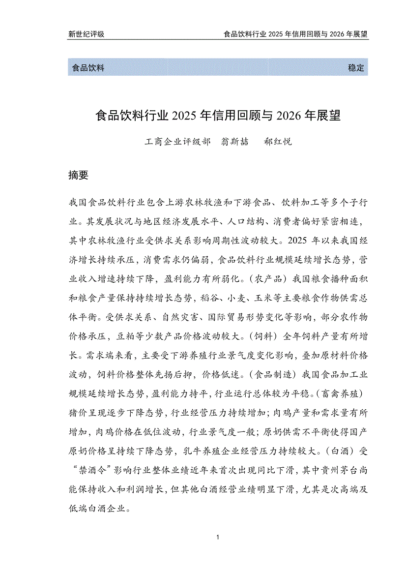 食品飲料行業(yè):新世紀評級-食品飲料行業(yè)2025年信用回顧與2026年展望-260225
