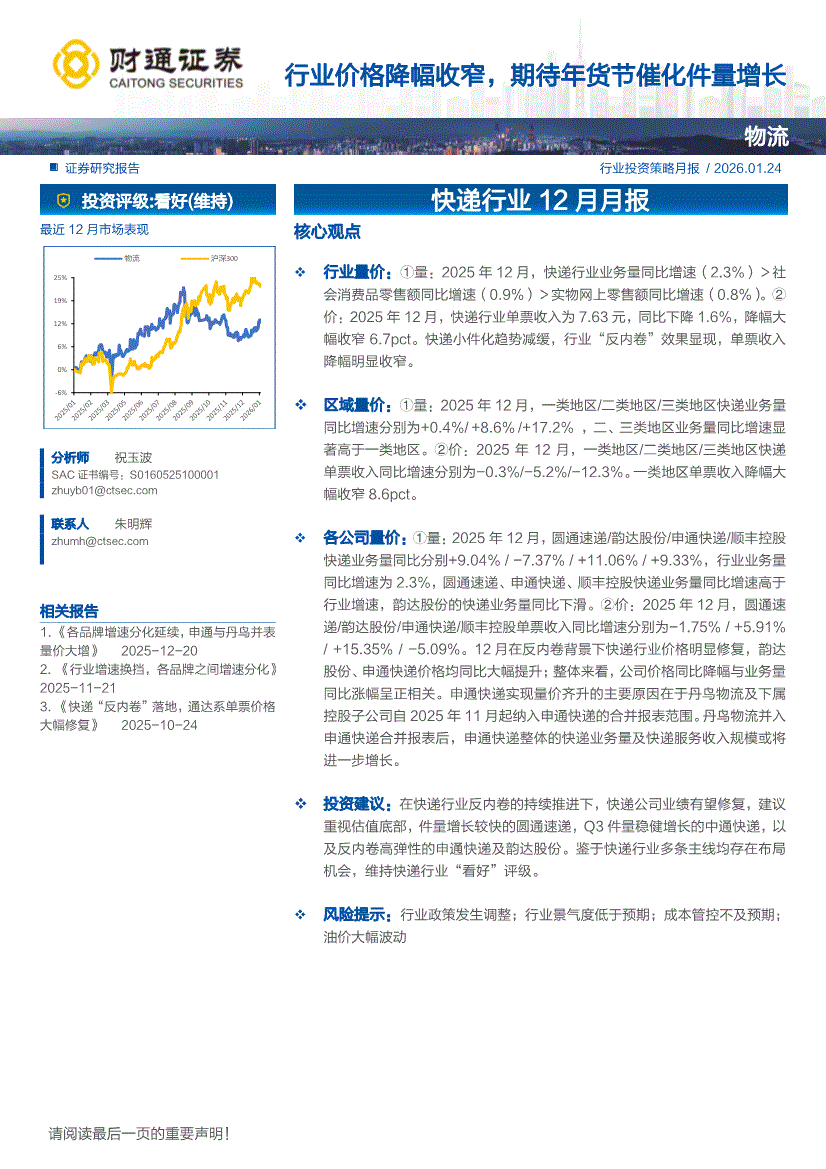 快遞行業(yè):財(cái)通證券-快遞行業(yè)12月月報(bào):行業(yè)價(jià)格降幅收窄,期待年貨節(jié)催化件量增長-260124
