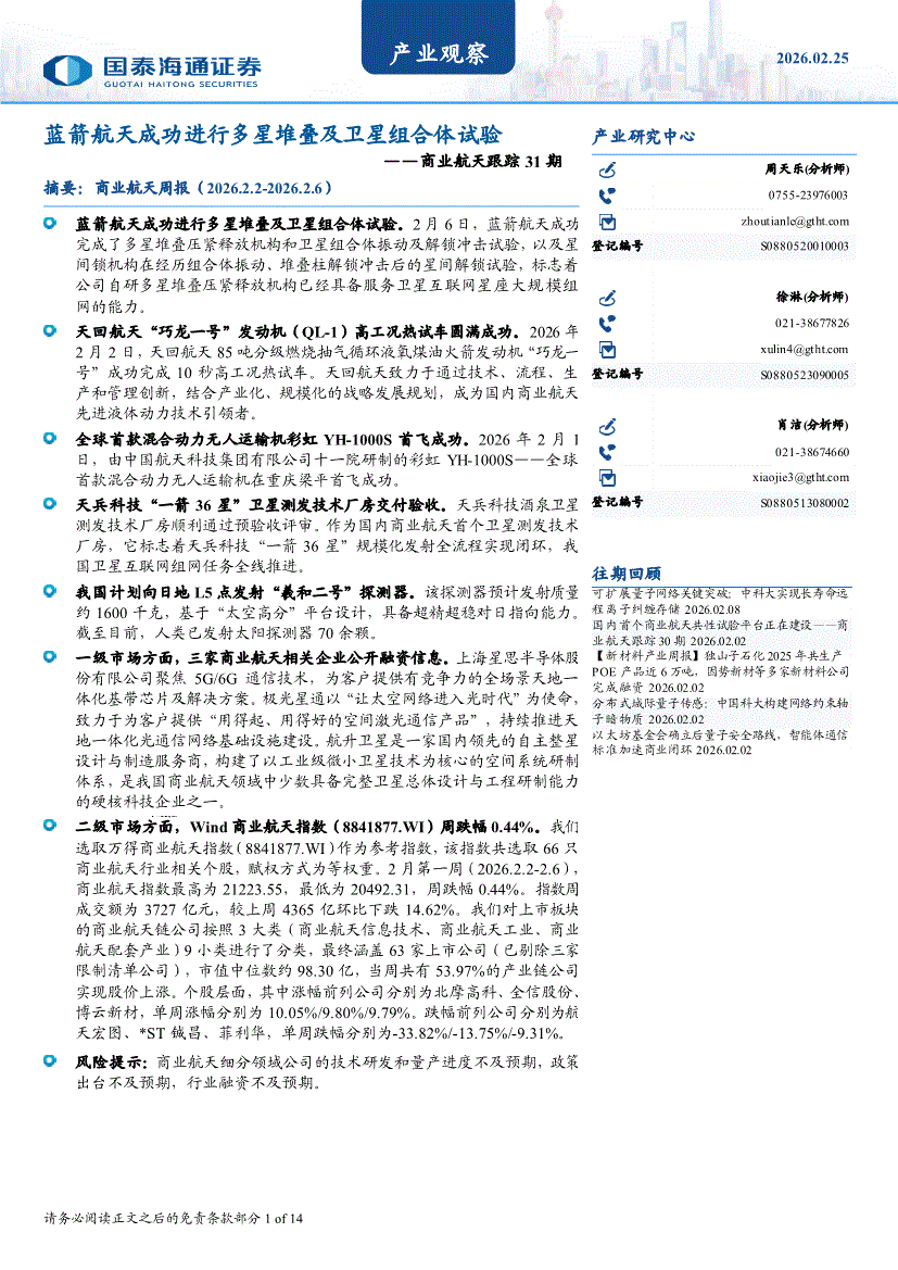 國(guó)泰海通證券-產(chǎn)業(yè)觀察:藍(lán)箭航天成功進(jìn)行多星堆疊及衛(wèi)星組合體試驗(yàn)——商業(yè)航天跟蹤31期-260225