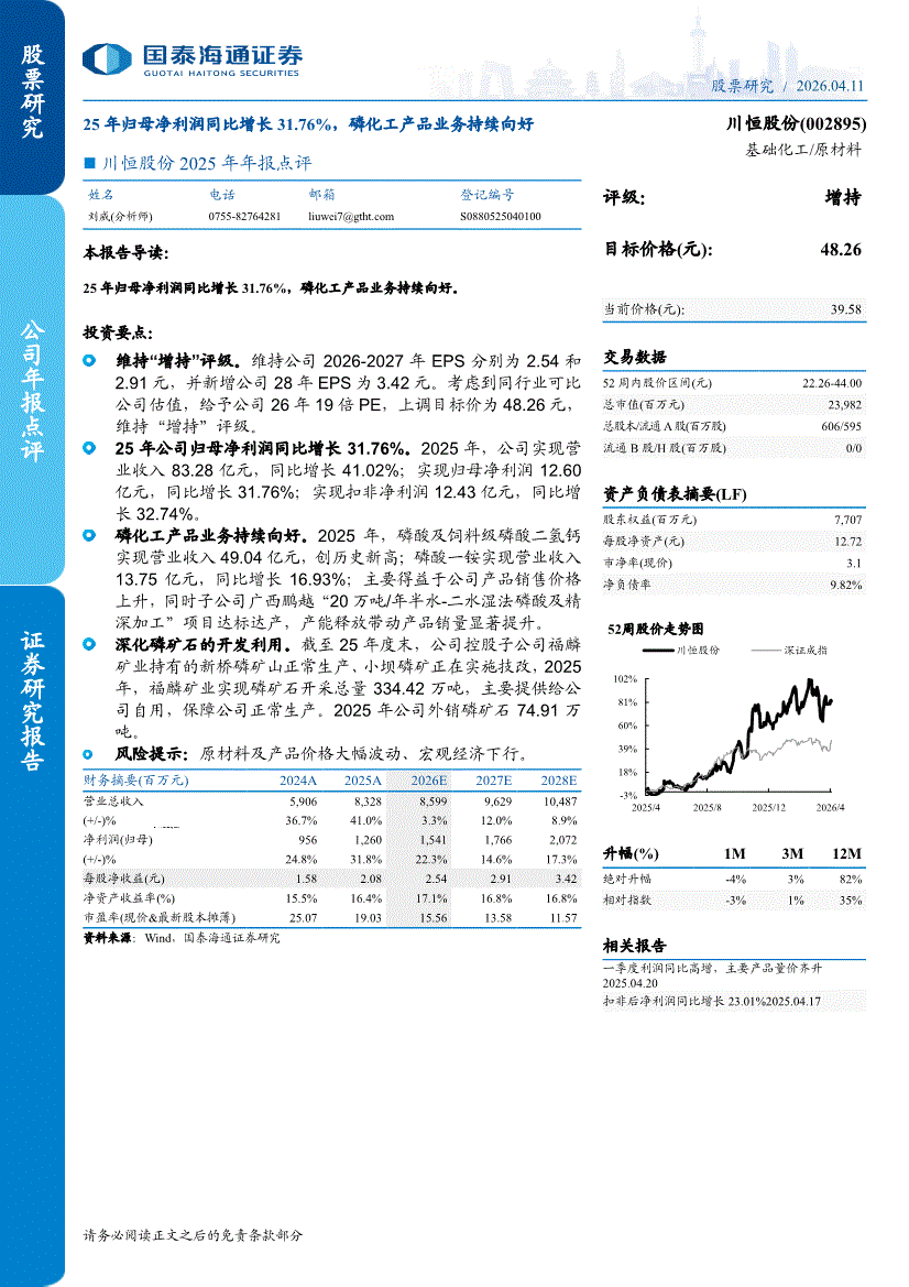 川恒股份:國泰海通證券-川恒股份-002895-2025年年報點評:25年歸母凈利潤同比增長31.76%,磷化工產(chǎn)品業(yè)務持續(xù)向好-260411