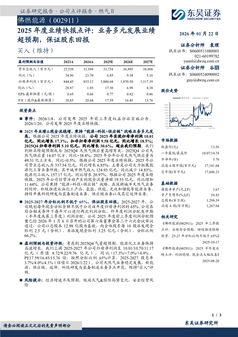 佛燃能源:東吳證券-佛燃能源-002911-2025年度業(yè)績快報點評:業(yè)務(wù)多元發(fā)展業(yè)績超預(yù)期,保證股東回報-260122