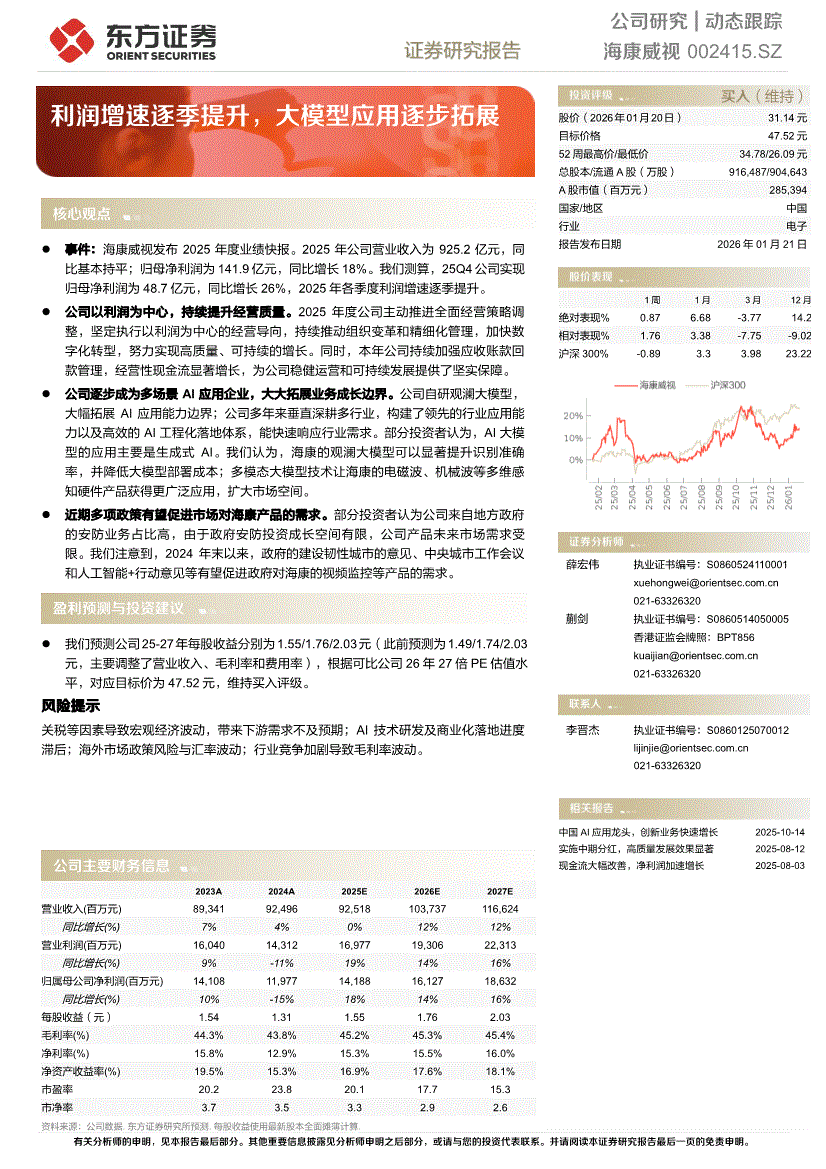 海康威視:東方證券-??低?002415-利潤增速逐季提升,大模型應用逐步拓展-260121