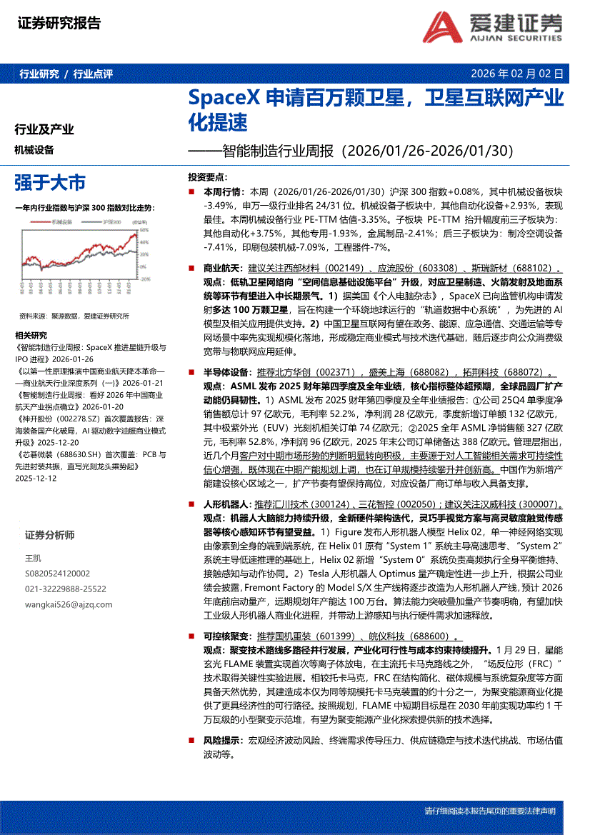 智能制造行業(yè):愛建證券-智能制造行業(yè)周報:SpaceX申請百萬顆衛(wèi)星,衛(wèi)星互聯(lián)網(wǎng)產(chǎn)業(yè)化提速-260202