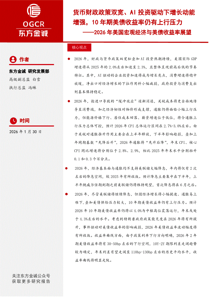 東方金誠(chéng)-2026年美國(guó)宏觀經(jīng)濟(jì)與美債收益率展望:貨幣財(cái)政政策雙寬、AI投資驅(qū)動(dòng)下增長(zhǎng)動(dòng)能增強(qiáng),10年期美債收益率仍有上行壓力-260130