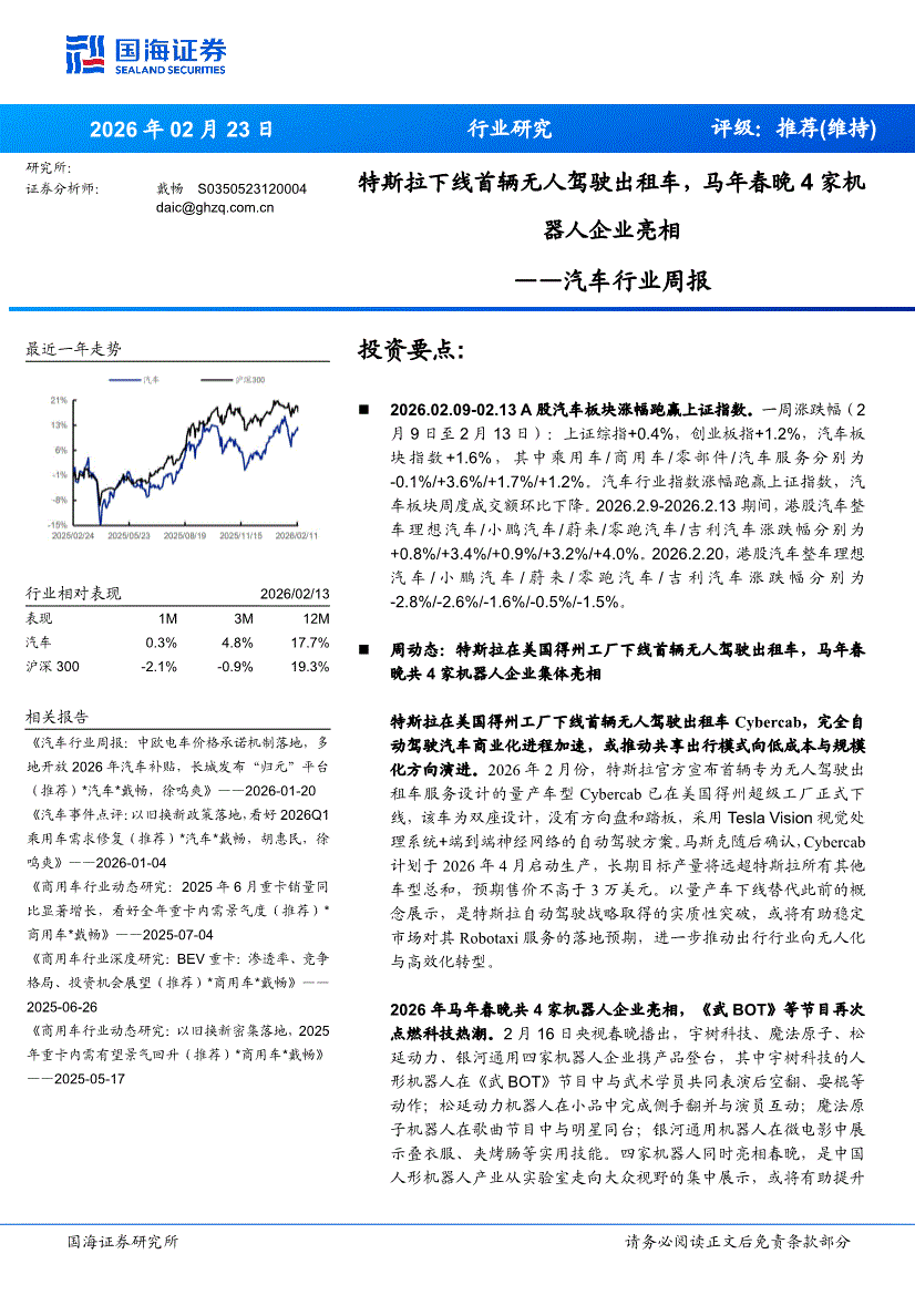 汽車行業(yè):國海證券-汽車行業(yè)周報(bào):特斯拉下線首輛無人駕駛出租車,馬年春晚4家機(jī)器人企業(yè)亮相-260223