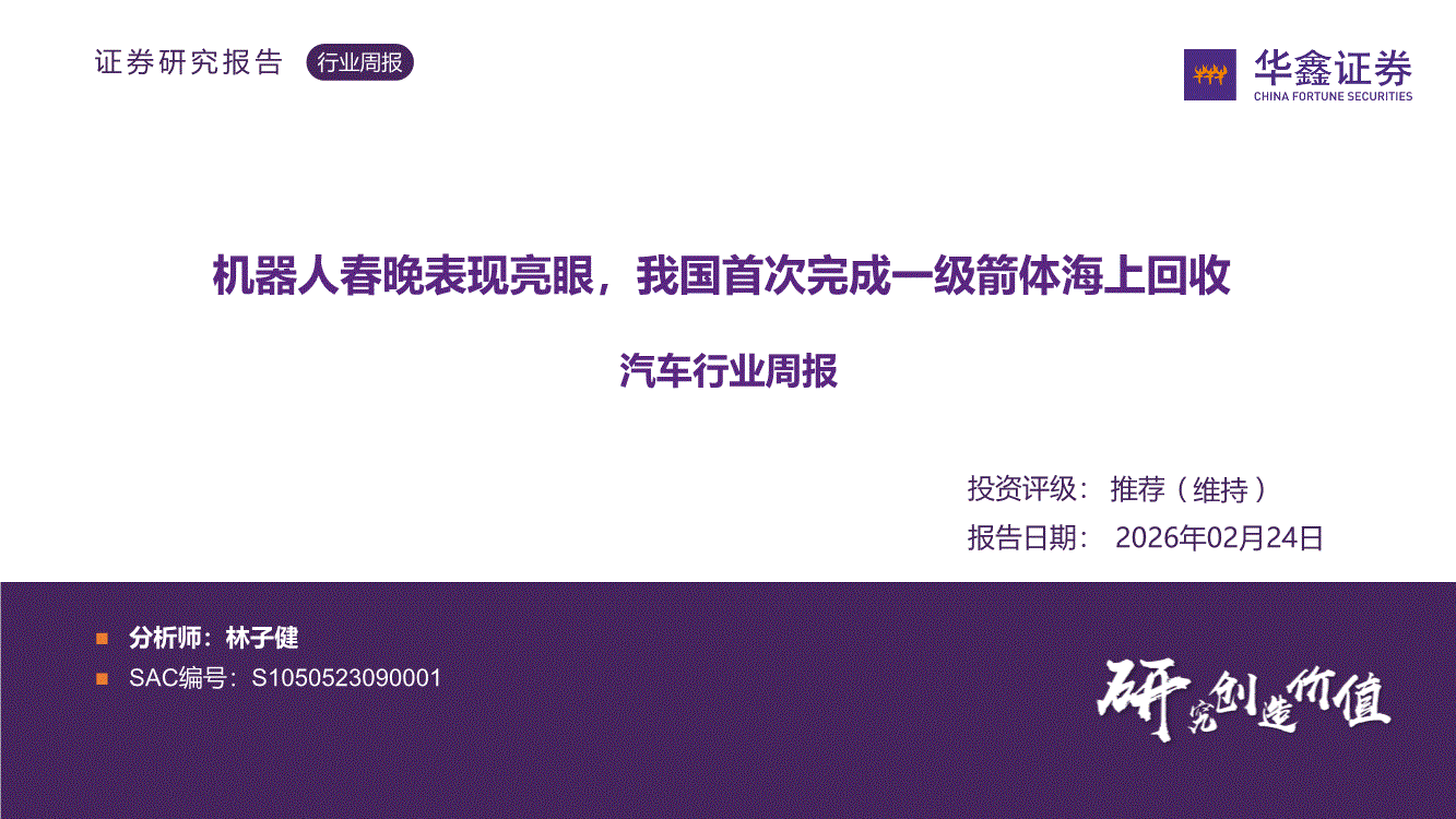 汽車行業(yè):華鑫證券-汽車行業(yè)周報:機(jī)器人春晚表現(xiàn)亮眼,我國首次完成一級箭體海上回收-260224
