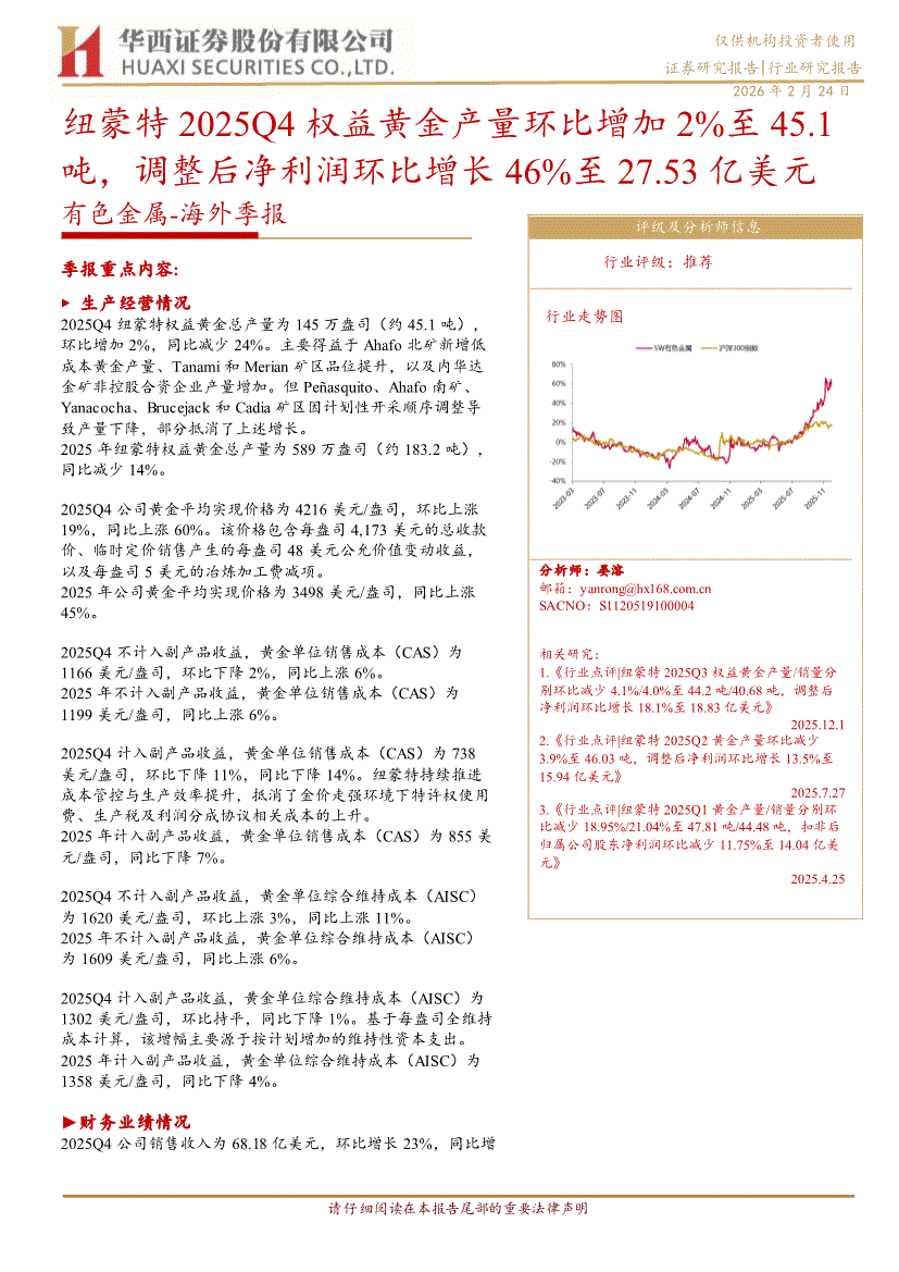 有色金屬行業(yè):華西證券-有色金屬行業(yè)~海外季報:紐蒙特2025Q4權(quán)益黃金產(chǎn)量環(huán)比增加2%至45.1噸,調(diào)整后凈利潤環(huán)比增長46%至27.53億美元-260224