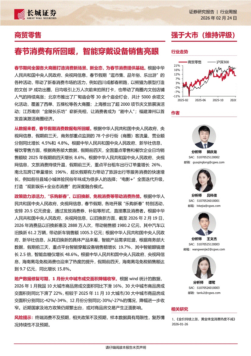 商貿(mào)零售行業(yè):長(zhǎng)城證券-商貿(mào)零售行業(yè)周報(bào):春節(jié)消費(fèi)有所回暖,智能穿戴設(shè)備銷售亮眼-260224