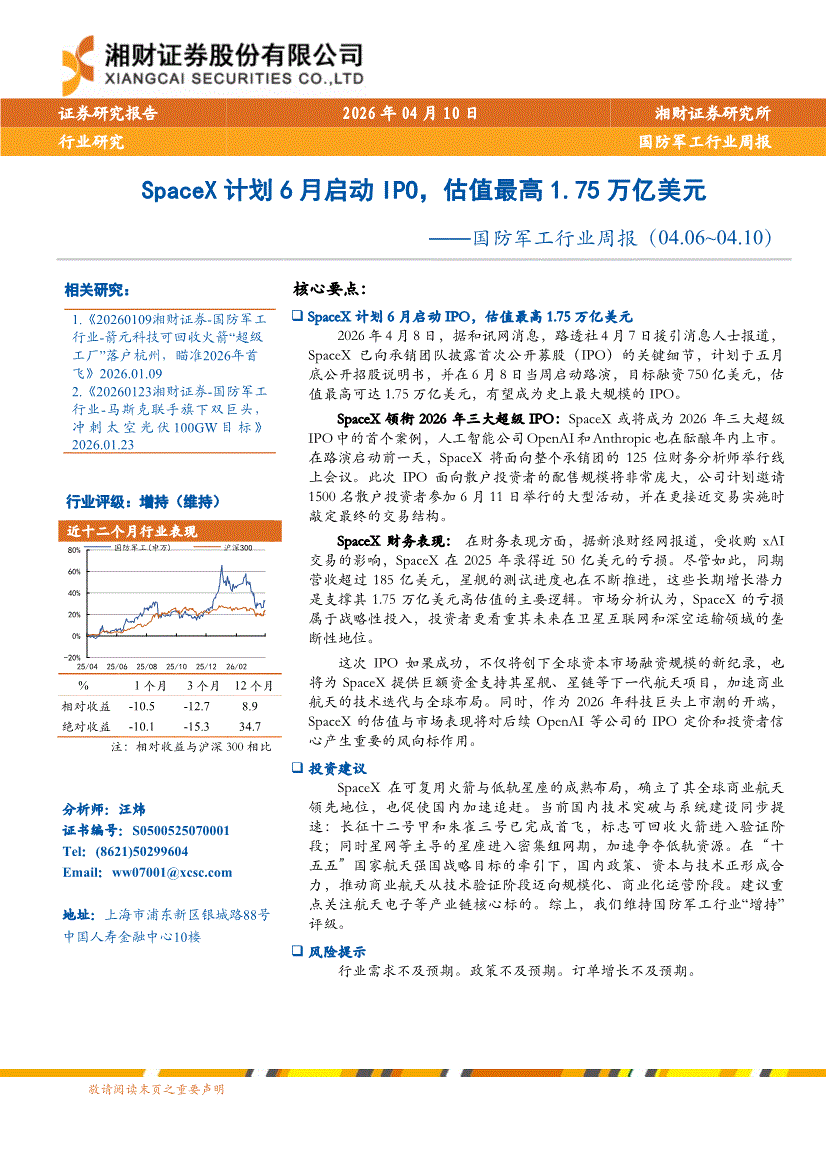 國防軍工行業(yè):湘財證券-國防軍工行業(yè)周報:SpaceX計劃6月啟動IPO,估值最高1.75萬億美元-260410