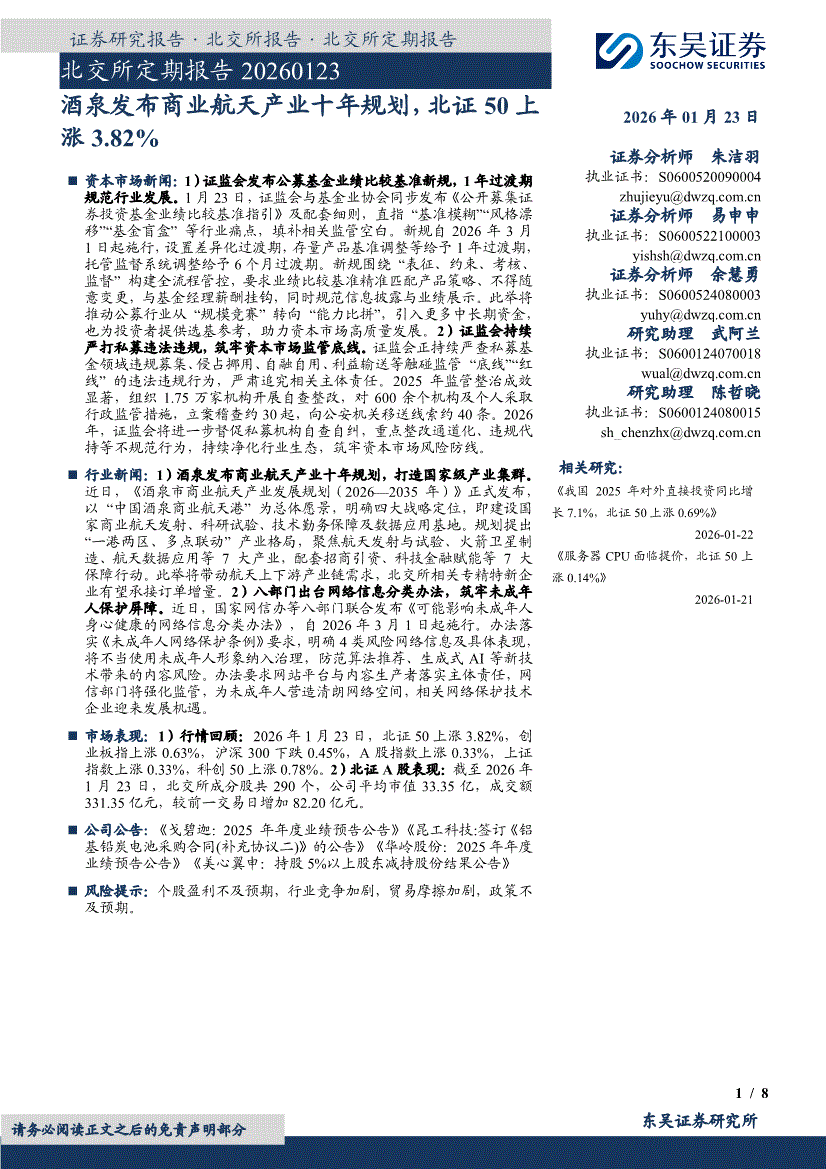 東吳證券-北交所定期報(bào)告:酒泉發(fā)布商業(yè)航天產(chǎn)業(yè)十年規(guī)劃,北證50上漲3.82%-260123