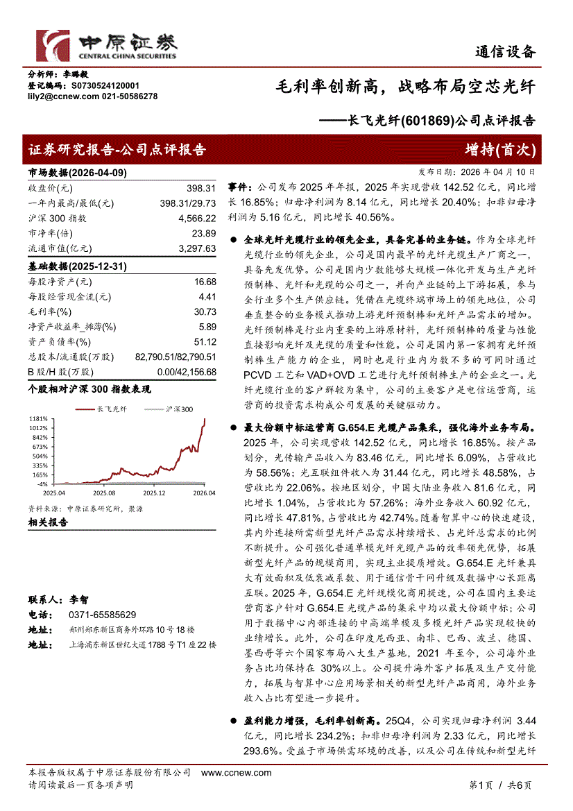 長(zhǎng)飛光纖:中原證券-長(zhǎng)飛光纖-601869-公司點(diǎn)評(píng)報(bào)告:毛利率創(chuàng)新高,戰(zhàn)略布局空芯光纖-260410