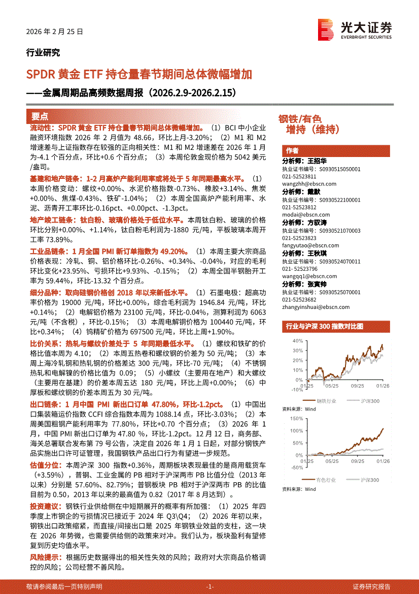 鋼鐵/有色行業(yè):光大證券-鋼鐵/有色行業(yè)金屬周期品高頻數(shù)據(jù)周報:SPDR黃金ETF持倉量春節(jié)期間總體微幅增加-260225